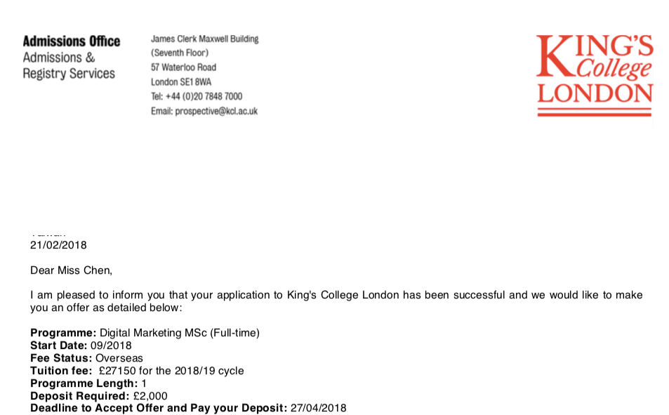 收到Offer 之後有整整兩個月期限“respond to offer”,讓申請者有較充裕的時間衡量比較其他的選擇。當初我曾寄信詢問KCL是否能讓我延期回覆,因為我到四月還在等Imperial College London的結果 (我的Dream school)。後來寫信去IC追問,過沒幾週便收到我的申請在waiting list 上,不保證能錄取,我才於心甘情願地接受了KCL的Offer。